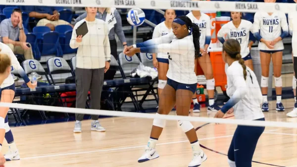 Georgetown managed to fend off the Patriots’ charge and closed the first set off with a kill from first-year Samantha Soderlund and a block from sophomore Dionna Mitchell, pulling away to win the first set 25-22.