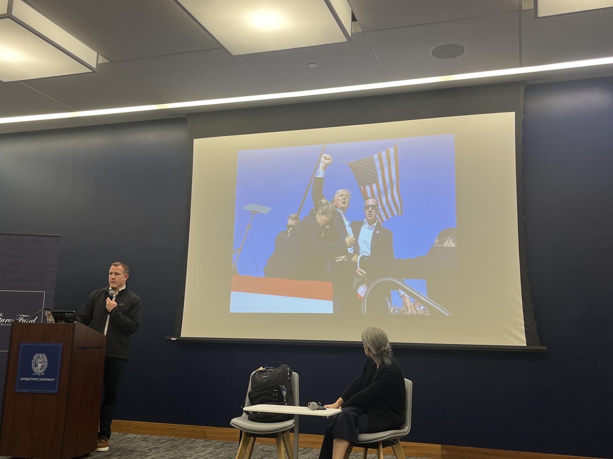 Evan Vucci, the AP’s chief photographer in Washington, D.C., has captured several famous moments throughout his career, including the “raised-fist” photo of President Donald Trump after his attempted assassination in Butler, Pa., on July 13, 2024. At the Georgetown event, Vucci recounted taking that photo of Trump, positioning it as the pinnacle of his career.