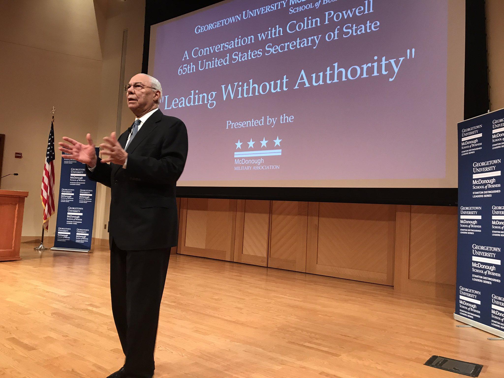 Powell’s remarks came in response to an audience question at an event titled “Leadership Without Authority,” the first in a McDonough School of Business speaker series of distinguished leaders. His speech included anecdotes from his 2012 book, “It Worked for Me: In Life and Leadership,” and tips on effective leadership that he learned through decades of public service.