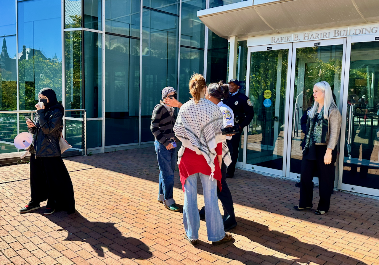 The group of protesters outside Hariri gathered near the first-floor entrance before marching to the third-floor entrance, where GUPD officers blocked the doors. The Hoya observed GUPD officers and Erika Cohen-Derr, the university’s associate vice president for student affairs, telling the protesters to move back to the ground level. The protesters complied after about five minutes.